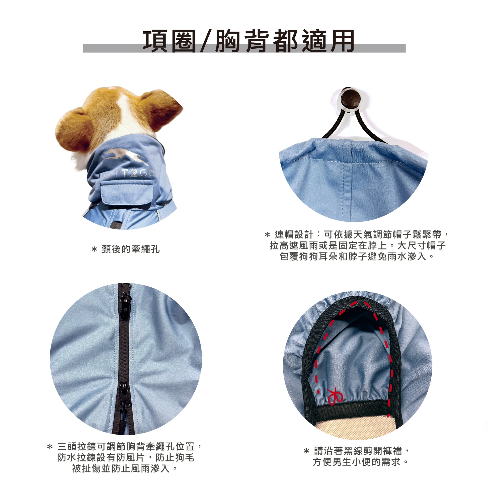 - 防風、防水且透氣,排出雨衣內多餘的熱氣和濕氣,在防雨水的同時避免了狗狗在悶濕環境中發生皮膚病。