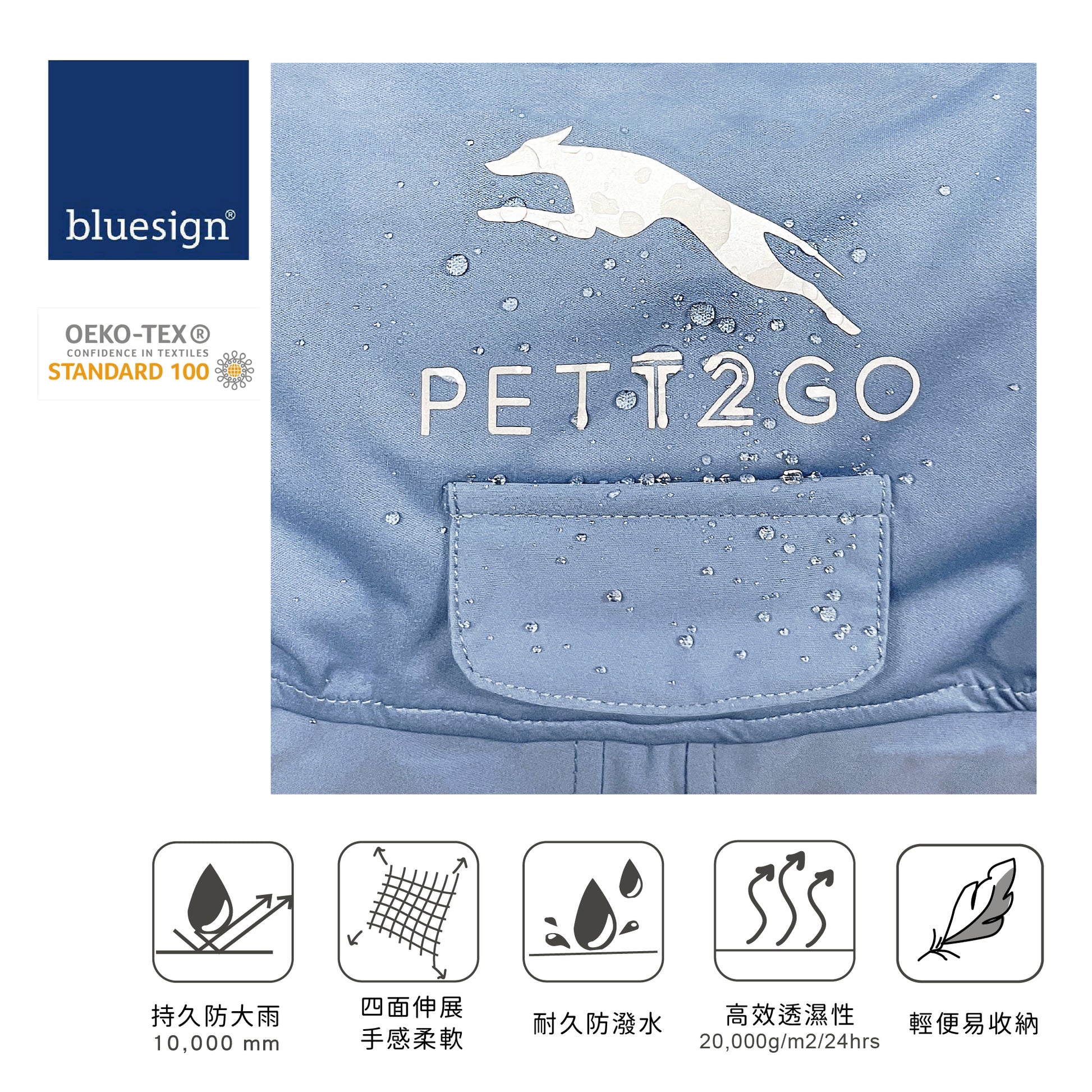 - 面料手感柔軟可四向伸展,讓狗狗在潮濕天氣也能舒適活動。
