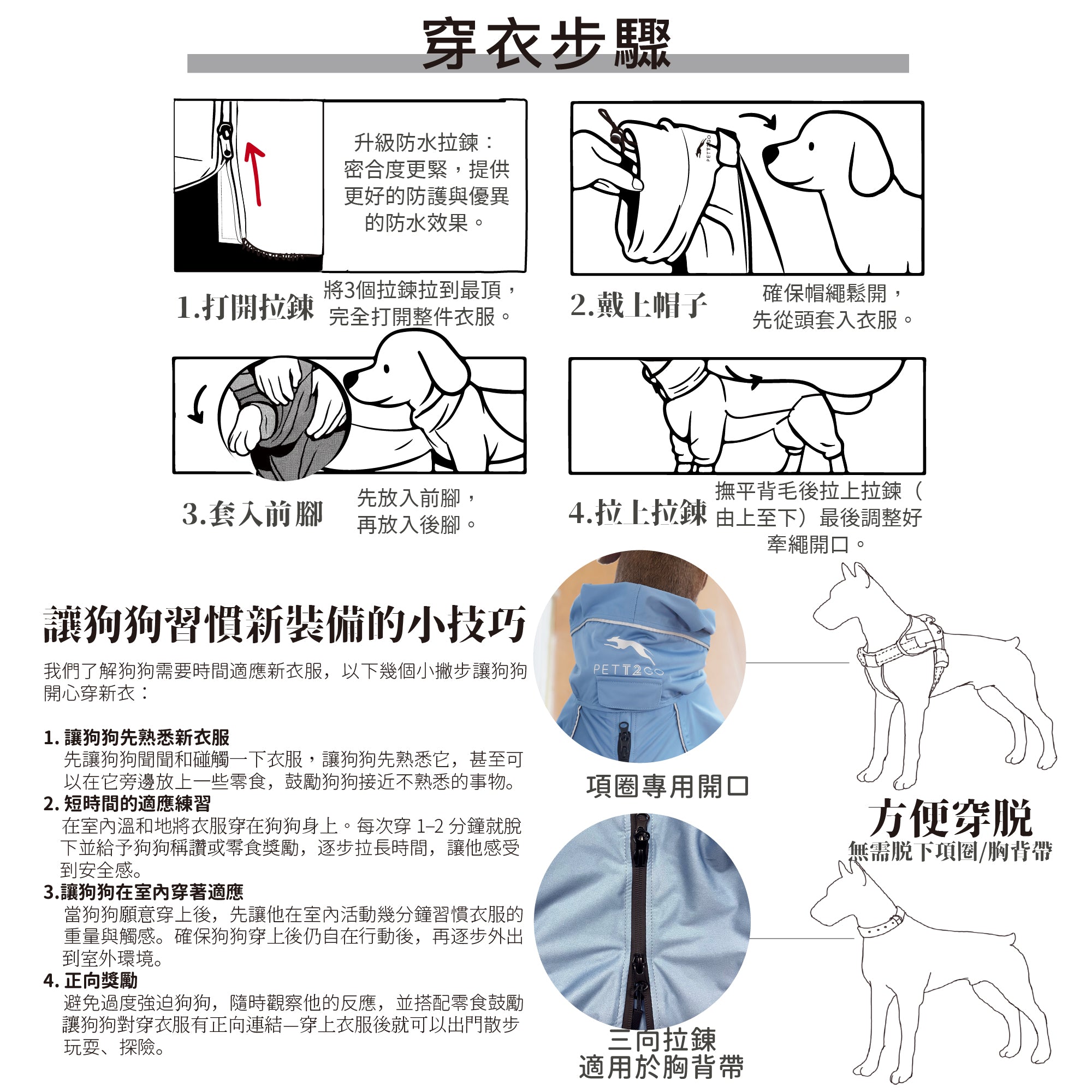 - 背部三向拉鍊:適用在服裝內佩戴胸背,可以調整拉鍊頭直至胸背牽引繩開口位置。