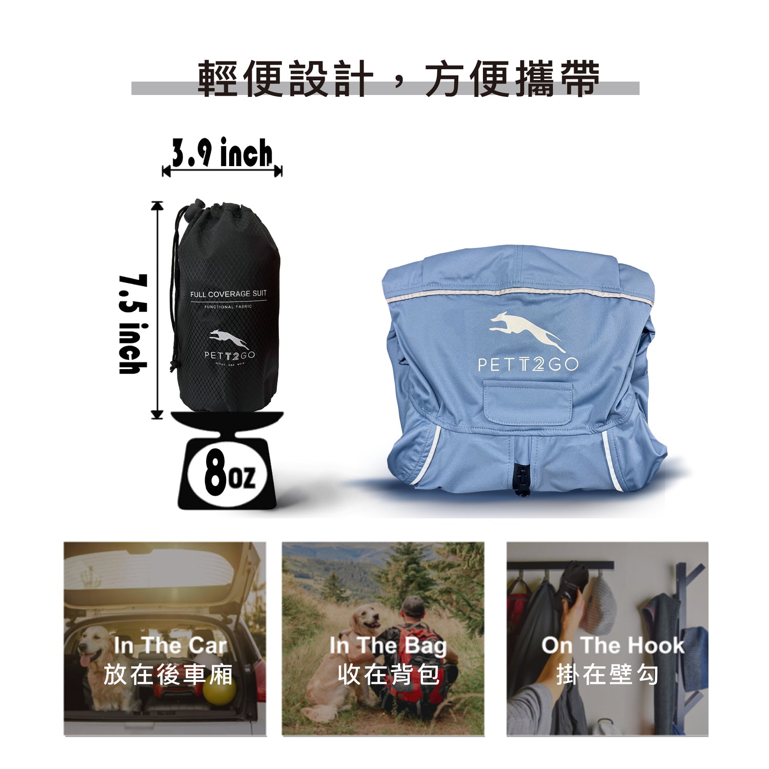 - 連身式的剪裁包覆住狗狗70%的皮膚,阻擋了戶外的蚊蟲和異物穿刺的危險,拉鍊式設計方方便狗狗穿脫。