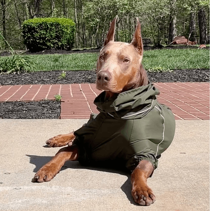 - The oversized hood can be adjusted to protect dog’s ears and neck.