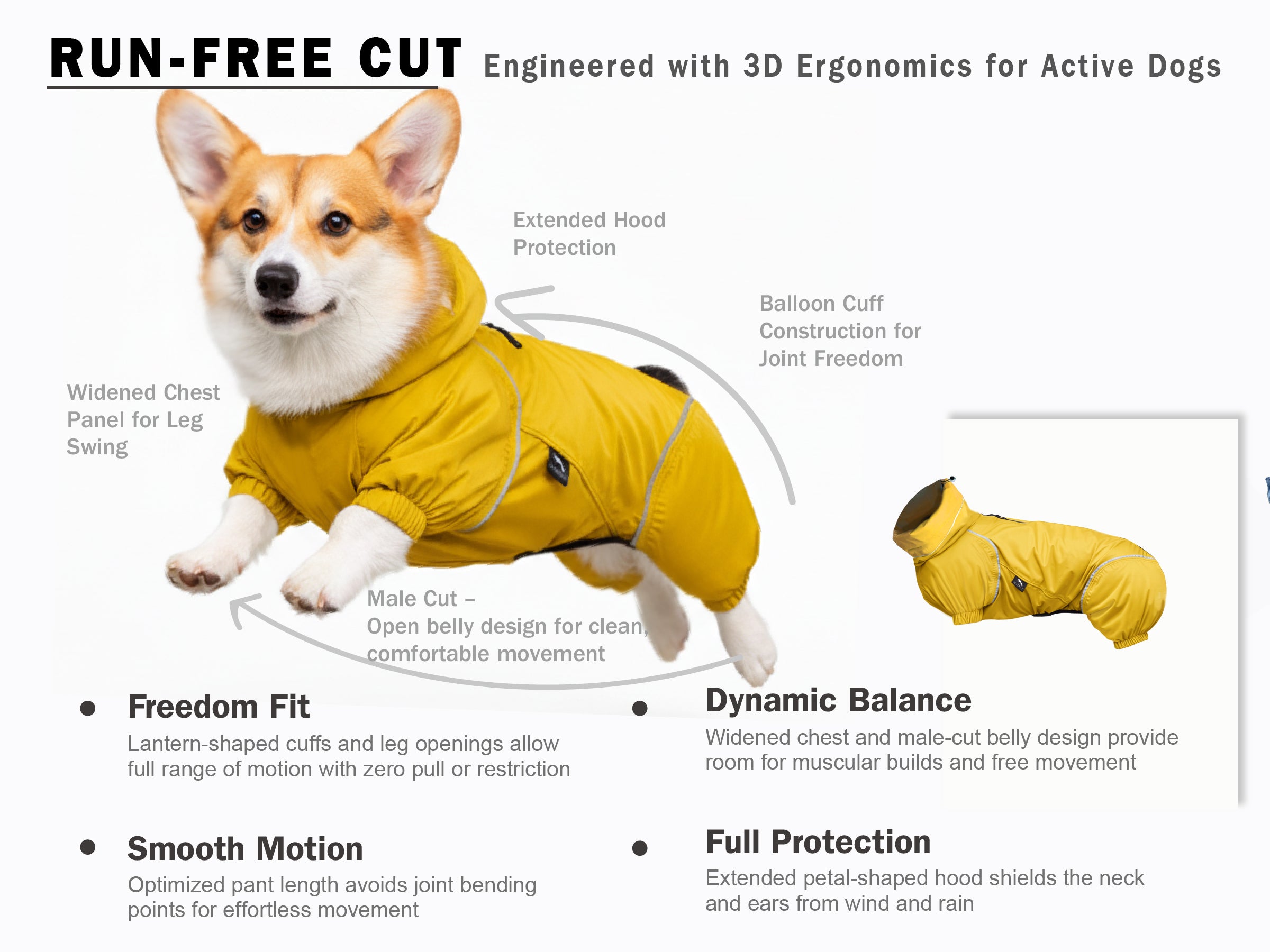 這款雨衣是專為柯基犬獨特的身形比例量身打造——包含寬厚的胸部、短短的腿以及偏長的身體。由 PETT2GO 設計的創新剪裁技術 Run-Free Cut,在前腿處採用縮短的褲長設計,並加深胸部的寬度,隨後收緊腹部的布打造出立體弧形曲線,讓衣服穿起來整體更加貼合、不壓迫,提供柯基最大的活動自由度。