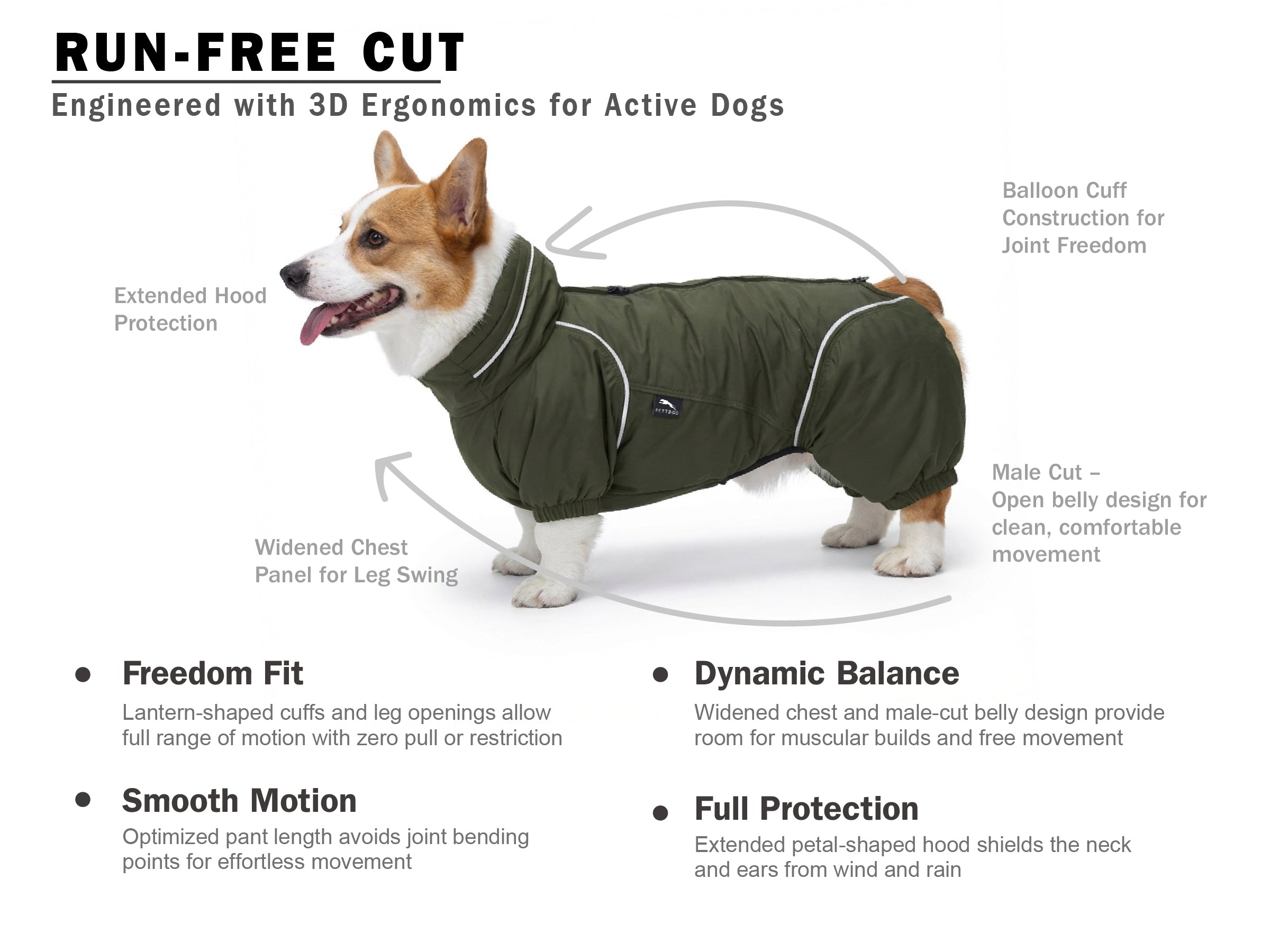 - 3D cut designed for dog's unrestricted movements even when the dog runs off-leash.
