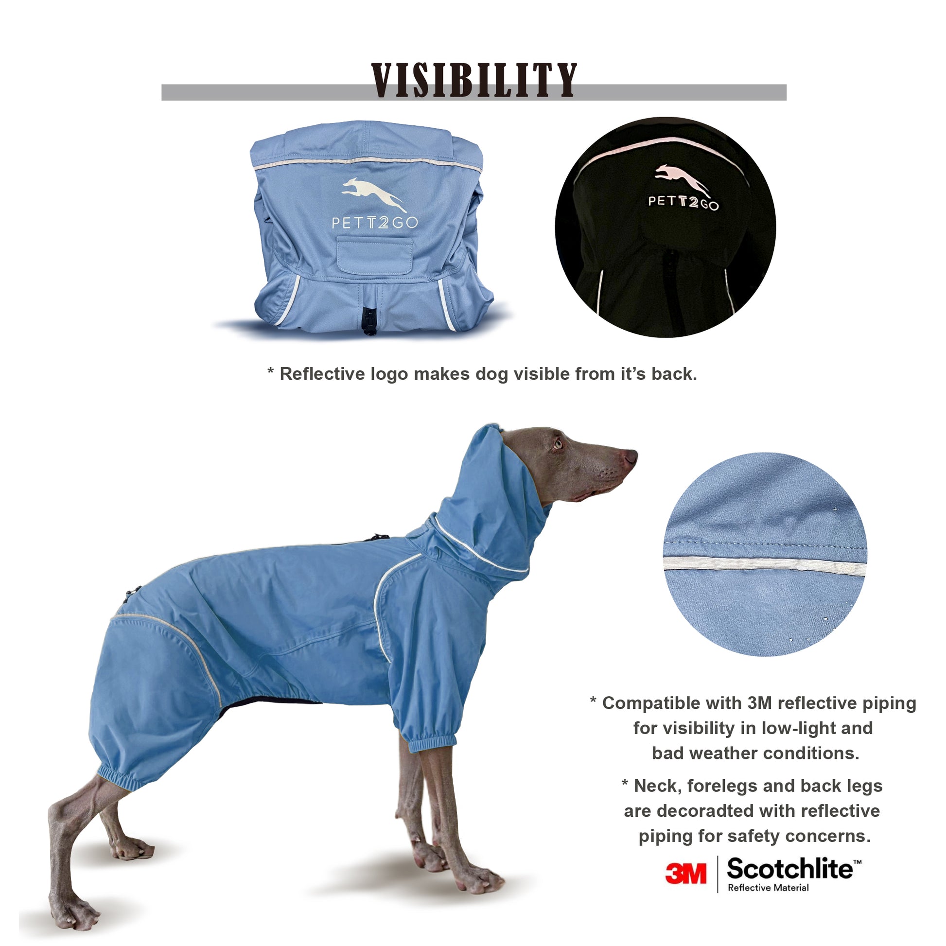 Dog raincoat sewed with 3M reflective piping, and bright, contrasting colors for visibility and safety in low-light and bad weather conditions.